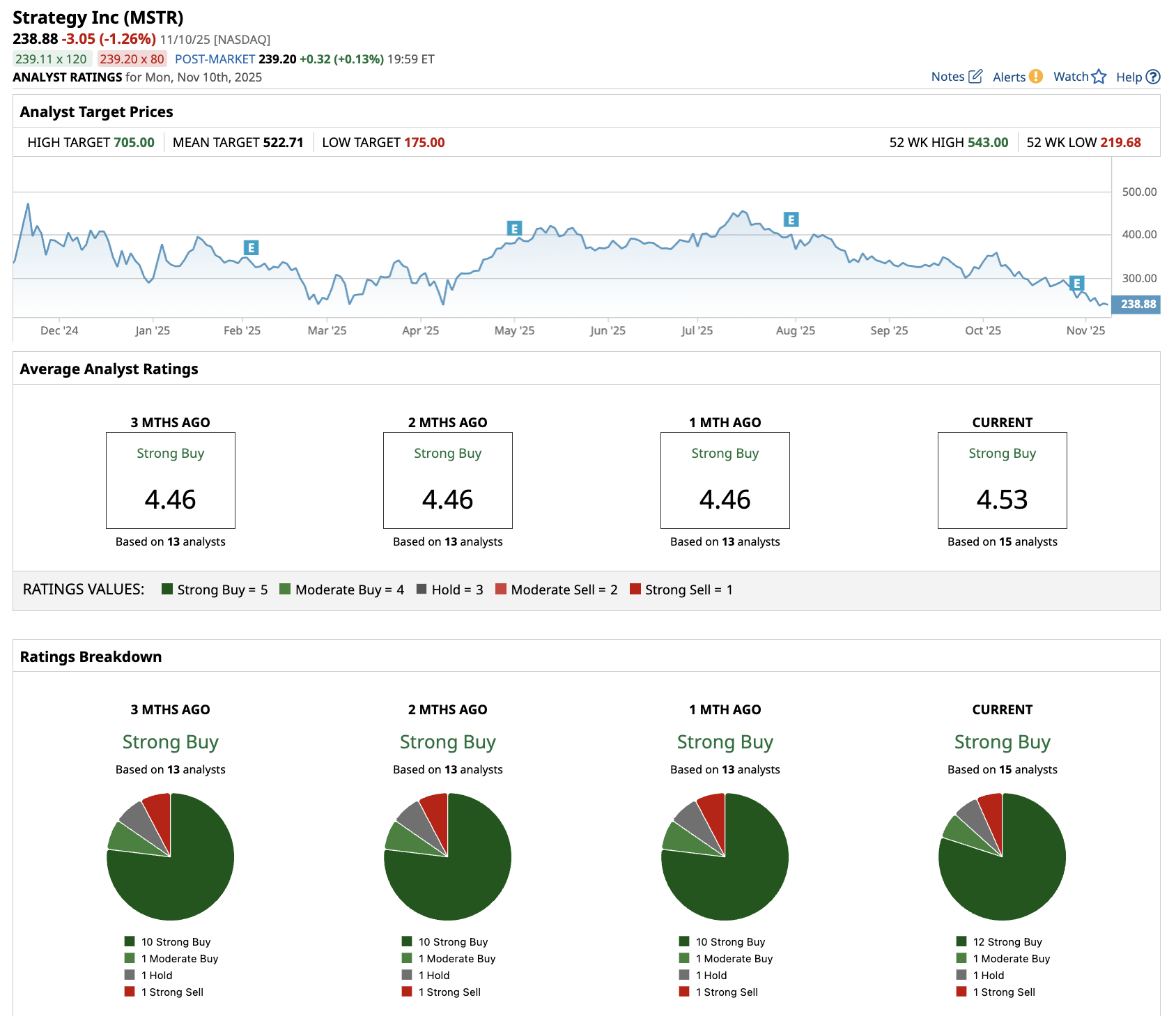 Out of the 15 analysts covering MSTR stock, 12 recommend “Strong Buy,” one recommends “Moderate Buy,” one recommends “Hold,” and one recommends “Strong Sell.” The average MSTR stock price target is about $523, indicating an upside potential of over 120% from current levels.