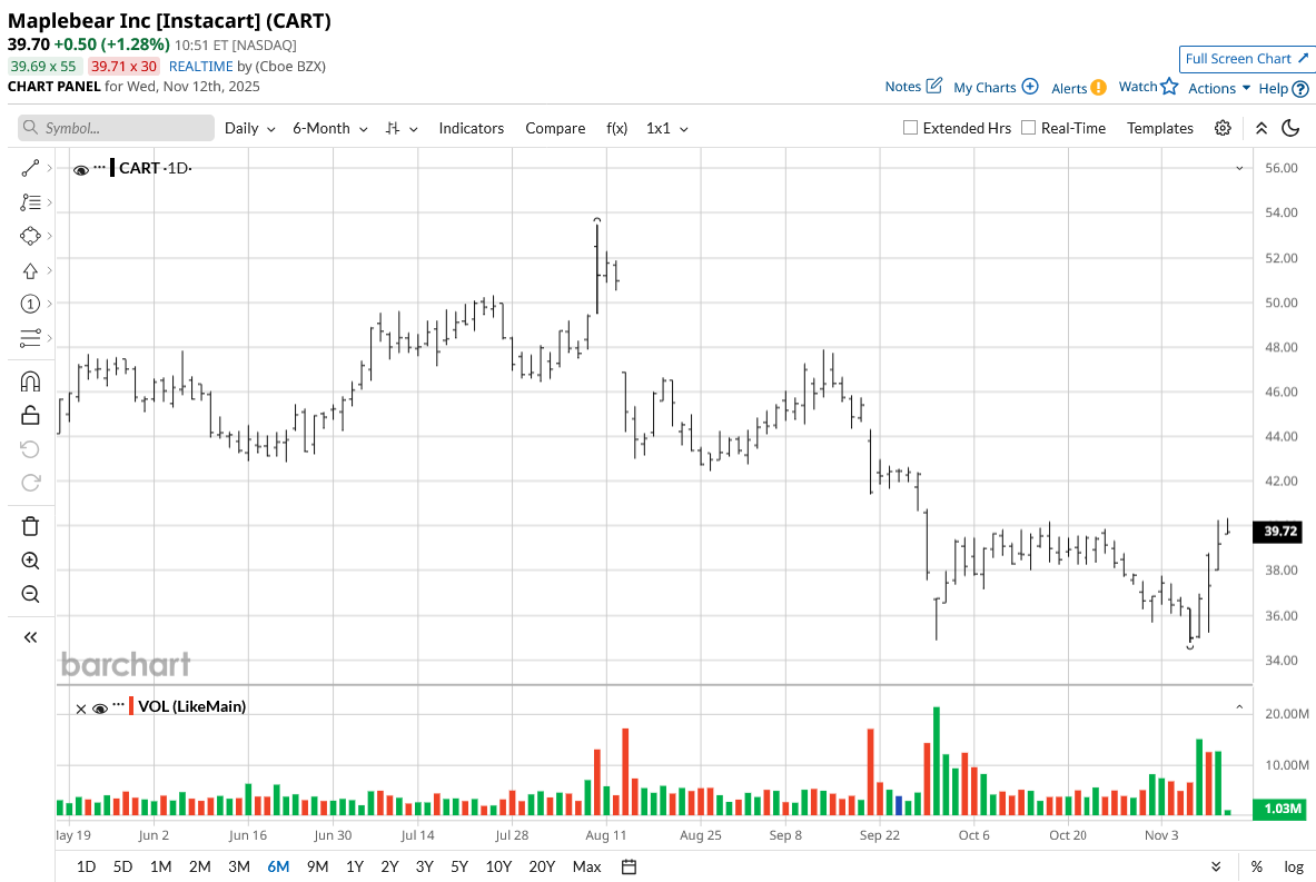 CART stock has shown renewed activity following strong Q3 results, posting a five-day gain of 9.7% yet remaining nearly flat for the month at 4.3%. Over the past six months, shares are down 8.4%, and the 52-week return stands at -17.3%, underperforming the Nasdaq Composite ($NASX), which has gained over 21% during the same period.