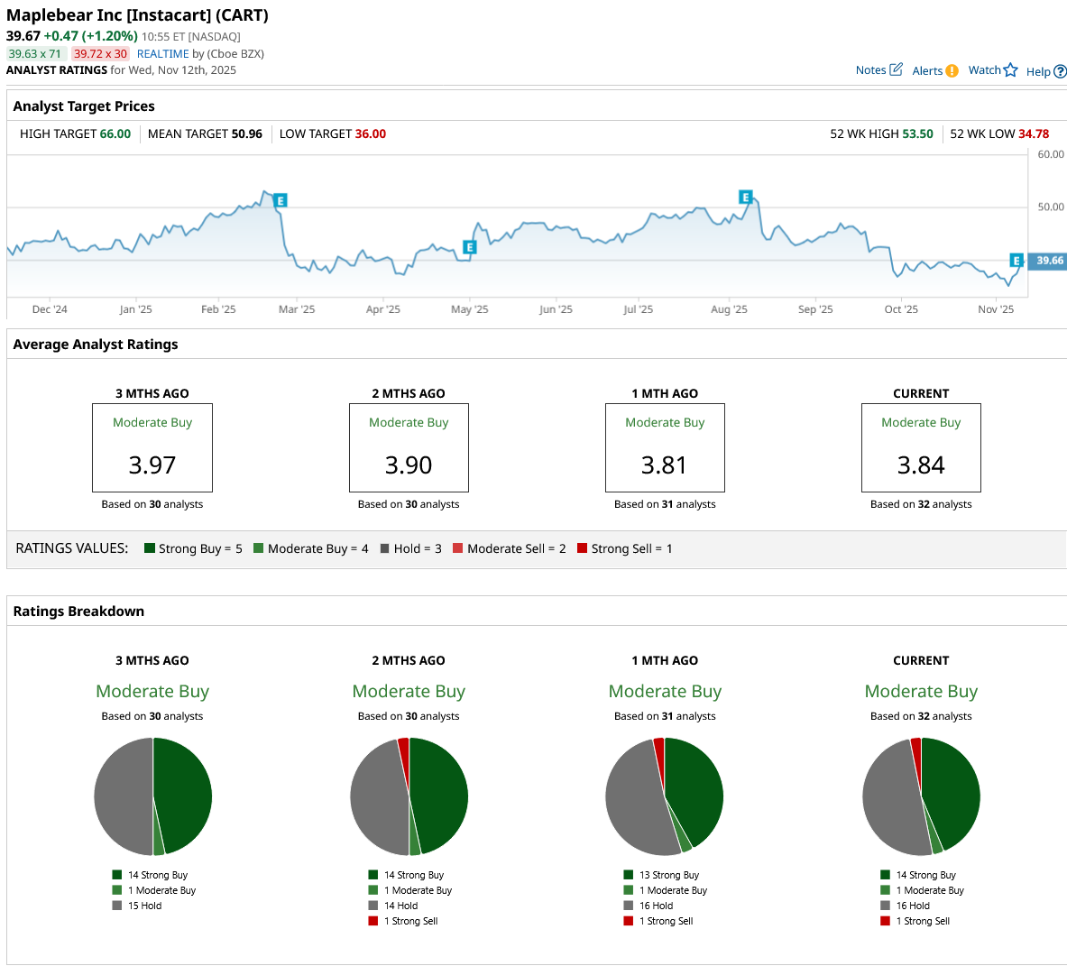 CART stock appears to have a positive tone among Wall Street experts with a consensus “Moderate Buy” rating and a mean price target of $50.96, reflecting an upside potential of 28%. However, the street-high target of $66 implies an upside of nearly 70% from the market rate. Goldman Sachs is leading the way on Instacart, giving CART stock its street-high target, although this was after lowering it from $67 due to concerns about its advertising business.
