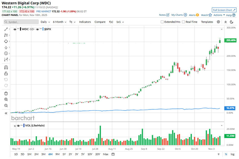Over the past year, shares of WDC have delivered a staggering 246% rally, and the stock is up 271% in 2025 alone. That kind of performance leaves the broader S&P 500 Index’s ($SPX) 14% one-year gain and 16% year-to-date (YTD) advance in the dust. In fact, WDC stock has surged nearly 257% in just the last six months and sits only about 7% below its recent peak of $178.45.