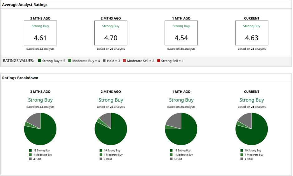 Even after its big rally, optimism hasn’t faded. The average price target of $172.91 implies 4% potential upside from current levels. Meanwhile, Loop Capital’s Street-high target of $250 suggests the stock could still climb another 50% from here.