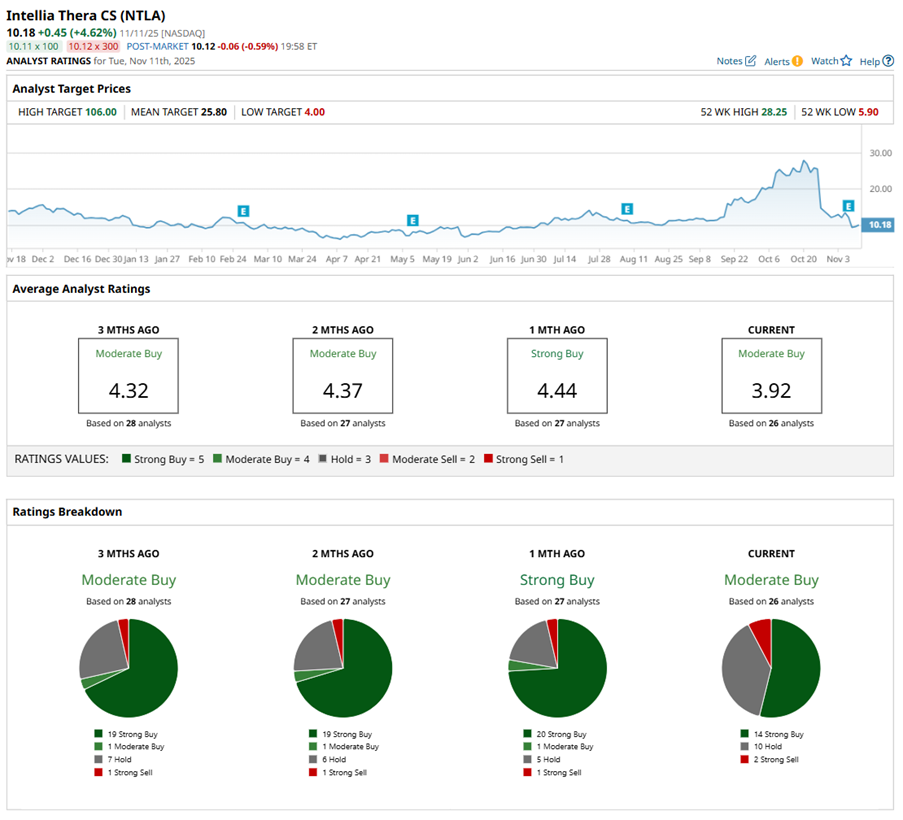 While still overall bullish, Wall Street’s tone has softened a little. NTLA stock has a consensus “Moderate Buy” rating overall. Of the 26 analysts rating the stock, 11 analysts recommend a “Strong Buy” rating, 13 are cautious with a “Hold” rating, and two analysts are outright skeptical with a “Strong Sell” rating.