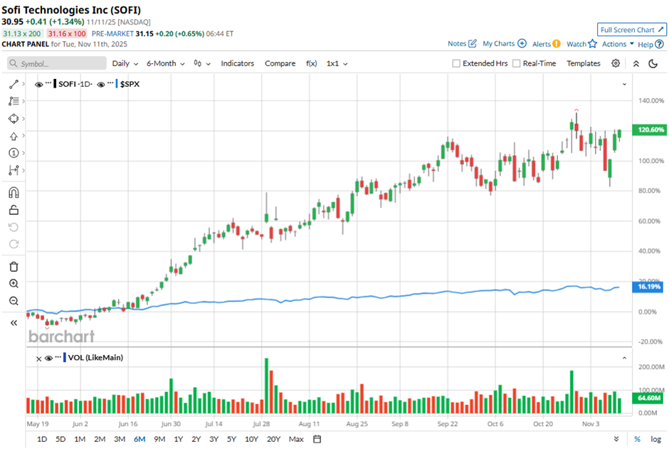 SoFi shares have performed strongly in 2025, supported by improving financials, record growth in members and an expanding lineup of financial products. Currently valued at about $37 billion by market capitalization, shares of the fintech company are up over 100% in 2025 and have climbed an impressive 129% in just the last six months. By comparison, the broader S&P 500 Index ($SPX) has recorded much softer gains of 16% year-to-date (YTD) and 17% over the past six months.