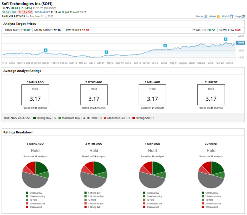 While SoFi has clearly won over investors, Wall Street isn’t entirely convinced just yet. Analysts remain cautious, with the stock carrying a consensus “Hold” rating. Of the 24 analysts covering the fintech name, only five call it a “Strong Buy,” two rate it a “Moderate Buy,” and 12 prefer to sit on the sidelines with a “Hold.” On the bearish side, two analysts tag it as a “Moderate Sell,” and three go further with a “Strong Sell.”
