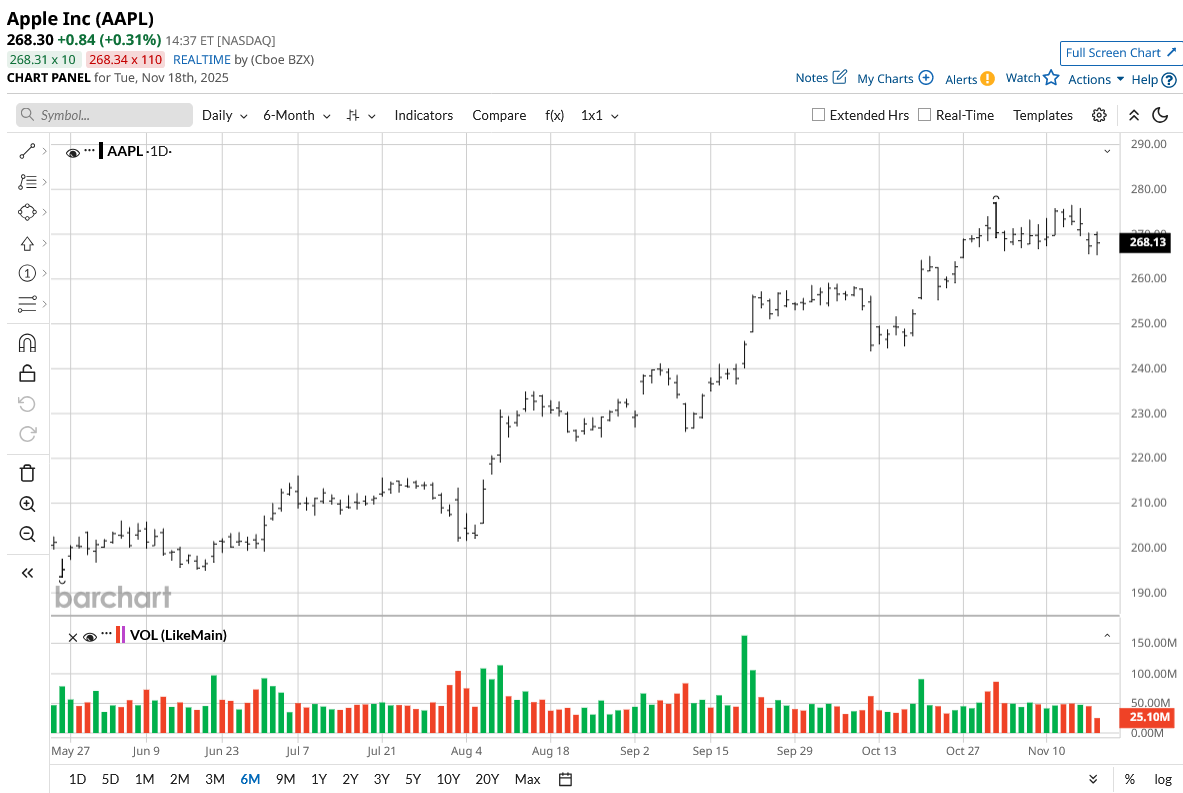 AAPL stock is trading close to its all-time highs, with the company valued at nearly $4 trillion, the second largest in the world after Nvidia. Despite this, it has underperformed the S&P 500’s ($SPX) 13.3% year-to-date (YTD) returns with its meager 7.2% performance so far this year. The stock was down 20% from its all-time highs in the first half of the year as concerns emerged regarding the iPhone maker’s AI plans, or the lack of them.