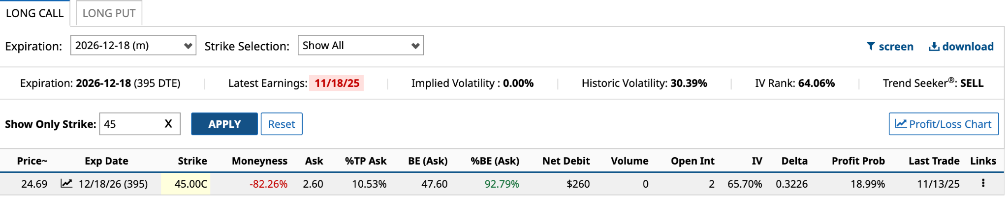 The $45 call expires at the same time as the CAVA call from earlier. The $260 net debit is 10.5% of its current share price. With an 18.99% profit probability, if the stock appreciates by 33%, you can double your money by selling the call before it expires in December 2026.