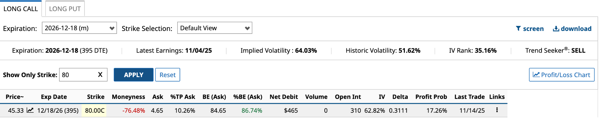 The same could be true for Cava. The $80 call expires just before Christmas in 2026. The $465 net debit is 10.3% of its current share price. While the 17.3% profit probability is low, there’s also a chance that the stock appreciates by 33% and you double your money by selling the call before it expires.