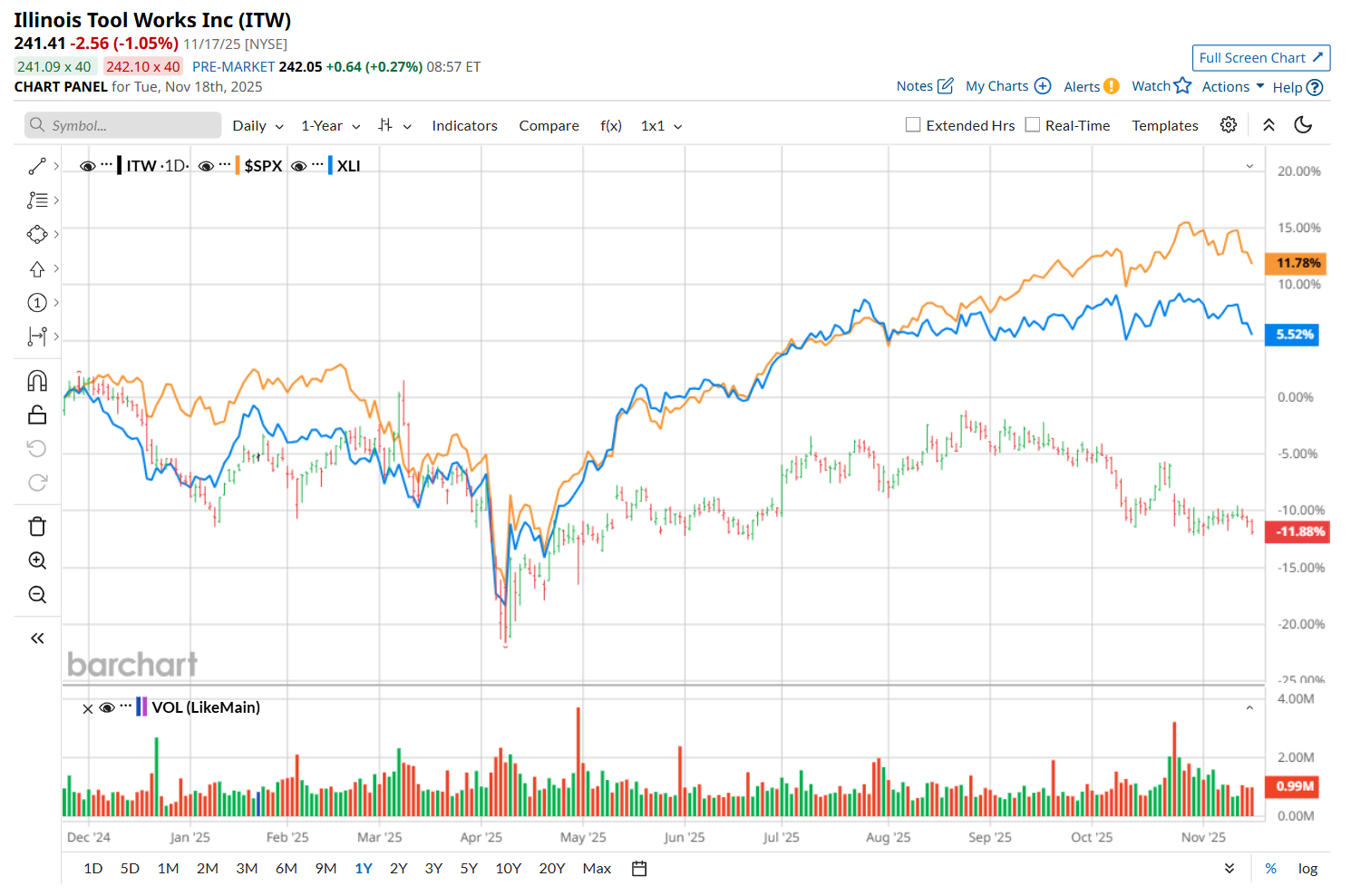 Narrowing the focus, ITW has also underperformed the Industrial Select Sector SPDR Fund’s (XLI) 7.8% uptick over the past 52 weeks and 13.7% YTD rise