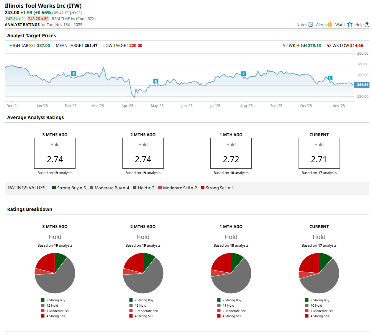 The mean price target of $261.47 represents a 7.6% premium from ITW’s current price levels, while the Street-high price target of $287 suggests an 18.1% potential upside from the current levels.