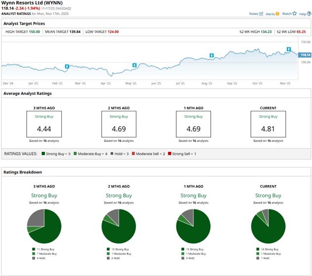 Among the 16 Wall Street analysts covering Wynn Resorts’ stock, the consensus is a “Strong Buy.” That’s based on 14 “Strong Buy” ratings, one “Moderate Buy,” and one “Hold.” The ratings configuration is more bullish than it was a month ago, with 14 “Strong Buy” ratings now, up from 13 previously.