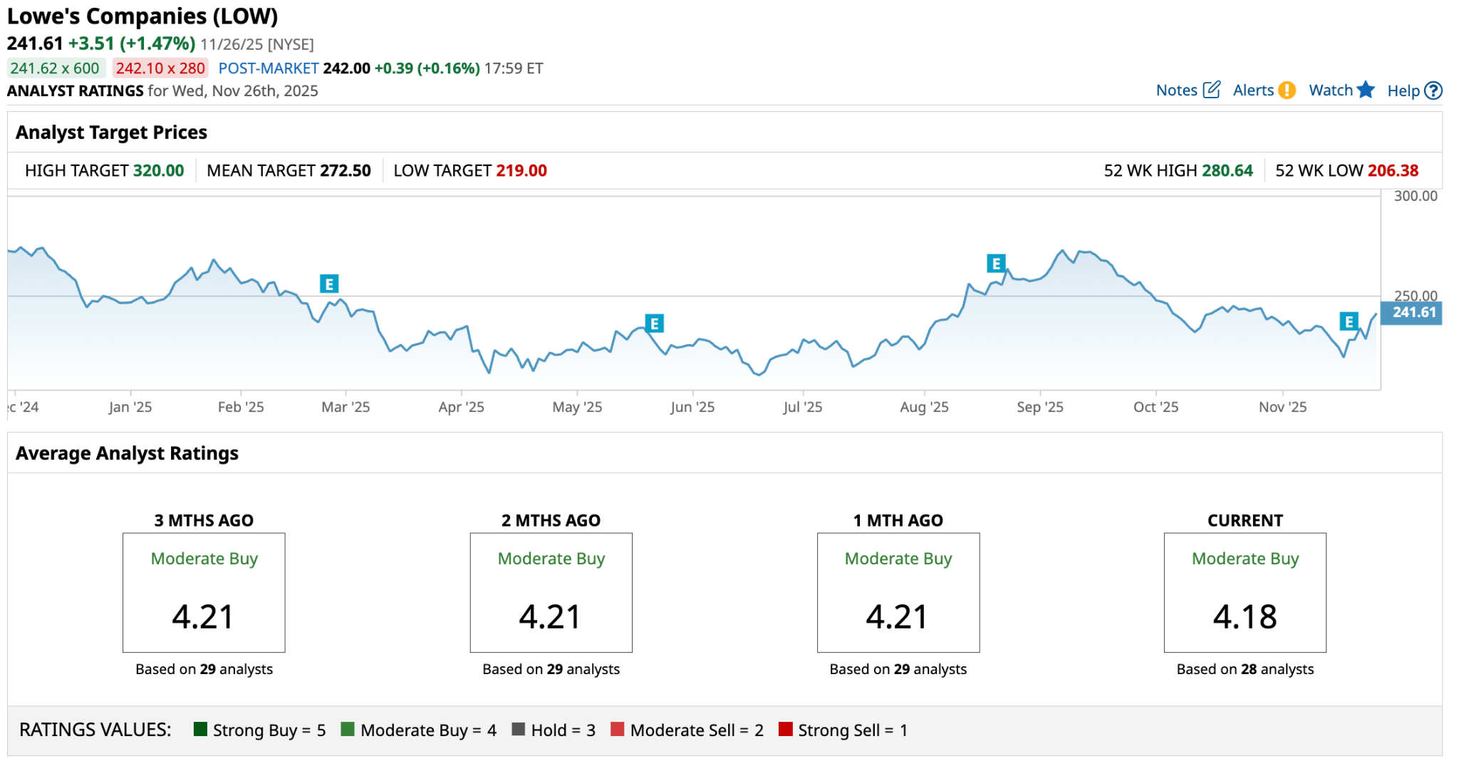 A consensus among 28 analysts rates the stock a “Moderate Buy”, a sentiment that is stable, though declining a touch over the past three months. The stock also has upside potential of around 35% if it hits the high target price of $320.