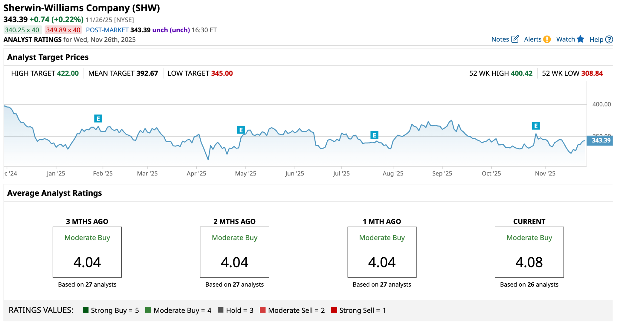 That said, a consensus among 26 analysts rates the stock a “Moderate Buy”, a rating consistent over the past three months. The high target price is $422, suggesting as much as 23% upside from today's prices.