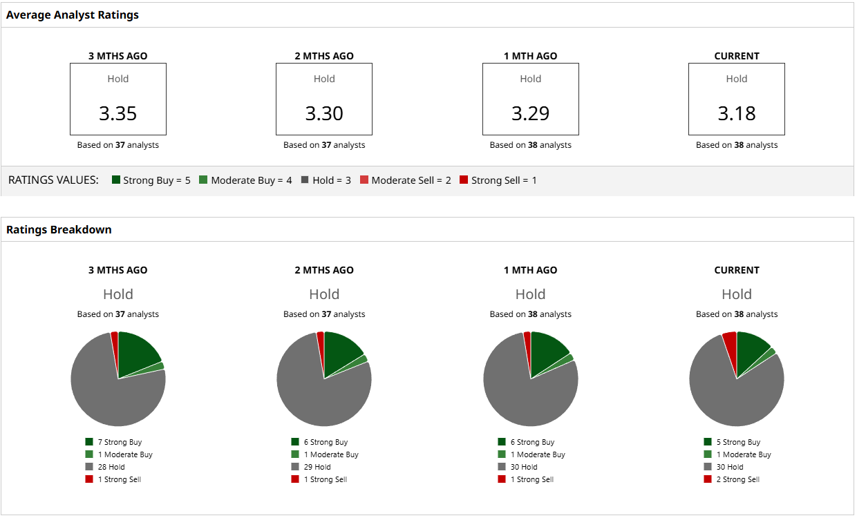 Analysts aren’t enamored with SNAP stock, but they aren’t pushing it off the table as well. Of the 38 analysts currently covering the stock, 30 of them suggest holding. Six say the stock is either a “Strong Buy” or "Moderate Buy" and two of them have “Strong Sell” ratings.