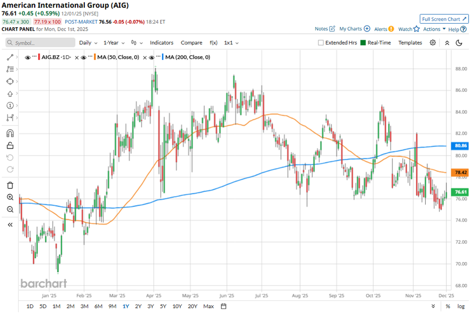 Shares of the New York-based company have declined over 13% from its 52-week high of $88.07. AIG stock has decreased 5.8% over the past three months, lagging behind the Nasdaq Composite’s ($NASX) 8.5% increase over the same time frame.