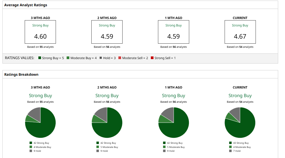 On average, analysts are pretty bullish. The consensus among 54 analysts is “Strong Buy,” with a mean price target of $323.35. That implies around a modest 2.5% upside from the current price.
