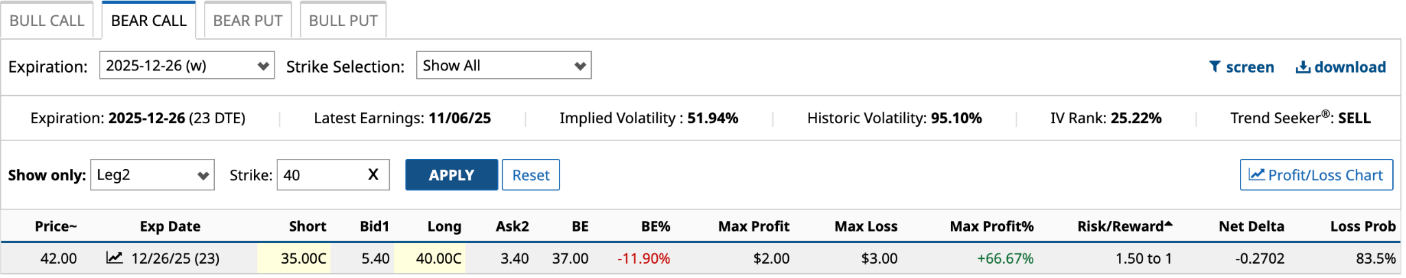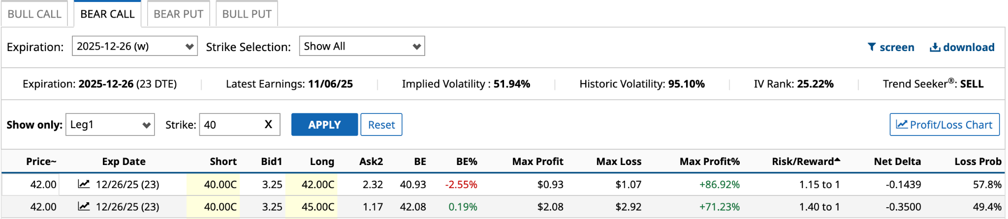 The risk/reward ratio of the $40 long call isn’t much different than the $45 long call from above. However, the loss probability is almost double, making it a much tougher bet. I’d stick with the $40 call short.