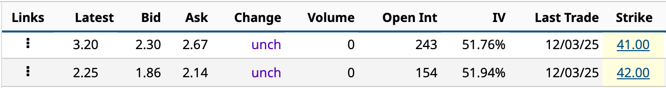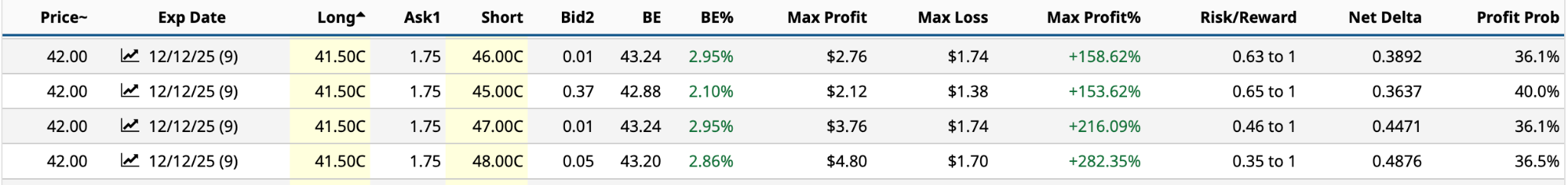 Unfortunately, there’s no volume, but let’s assume these bid prices are real. The $41 strike has a $135 net credit [$2.30 bid price * 2 - $3.25 ask price]. The $42 strike has a $47 net credit [$1.86 bid price * 2 - $3.25 ask price].
