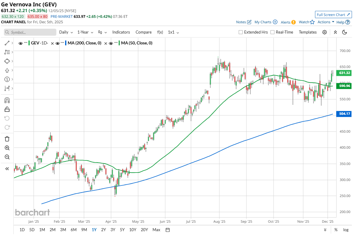 GEV has been trading largely above the 200-day moving average over the past year. Also, the stock mostly traded above the 50-day moving average except for some fluctuations and trading below the line in October and November.
