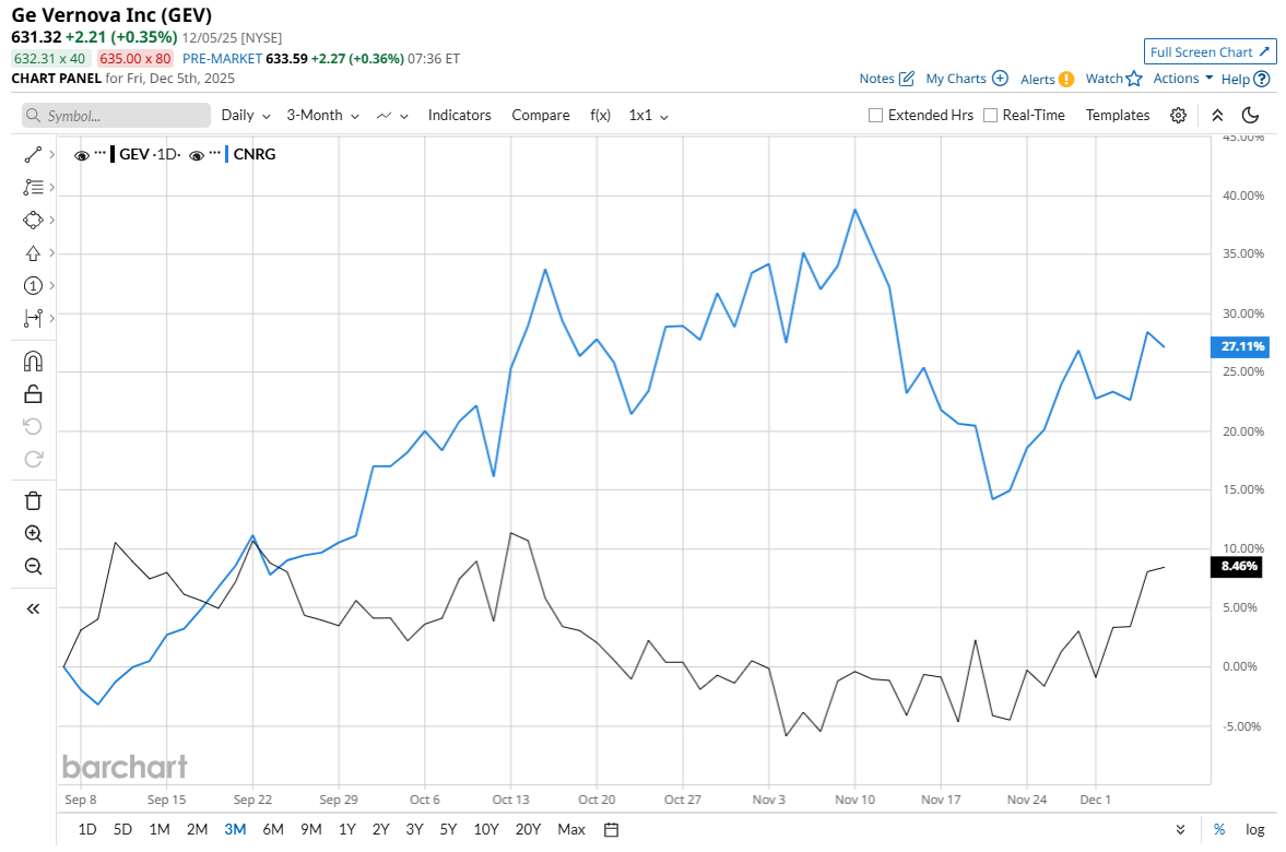 GEV is 6.8% down from its 52-week high of $677.29 reached on July 31. Shares are up 8.5% over the past three months, underperforming the broader SPDR Kensho Clean Power ETF’s (CNRG) 27.1% rise in the same period.