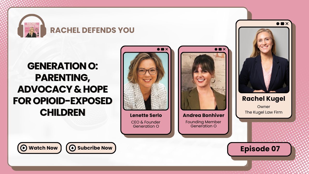 The Rachel Defends You podcast, hosted by criminal defense attorney Rachel Kugel, spotlights frontline voices working to protect vulnerable families and improve outcomes in the justice system. In this episode, Kugel welcomes Lenette Serlo and Andrea Bonhiver of Generation O for a substantive discussion on practical frameworks that support children with prenatal opioid exposure and the caregivers who raise them. For more information, visit The Kugel Law Firm.