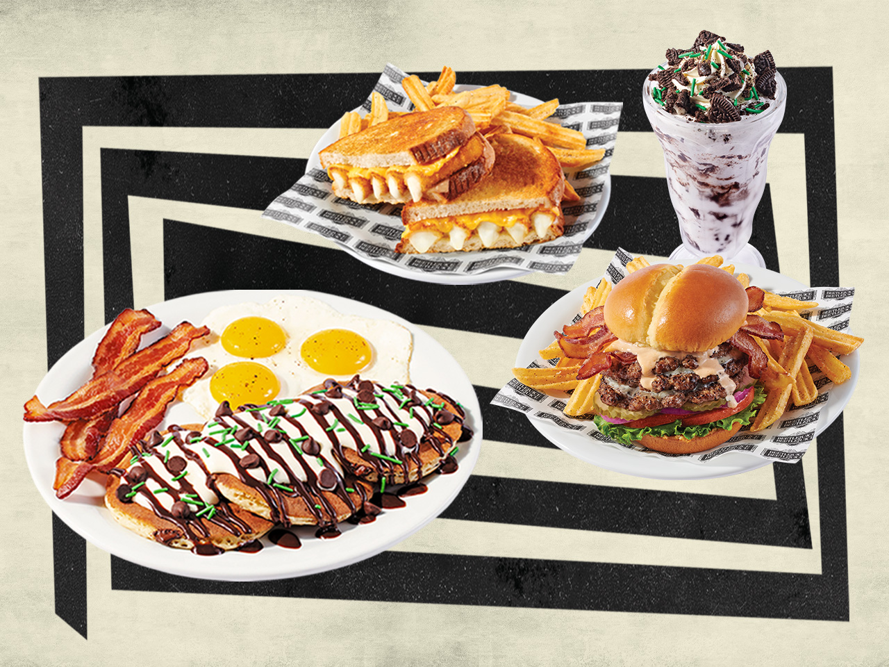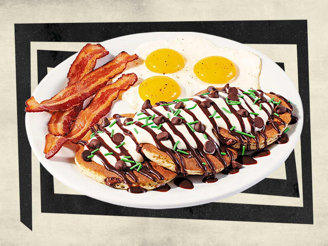 - NEW! Say it Three Times Slam®: A brand NEW, scary-good dish, inspired by Beetlejuice Beetlejuice. This bio-exorcist approved breakfast comes with three silver dollar chocolate chip pancakes topped with vanilla cream, chocolate sauce, chocolate chips, and green sprinkles. Served with three eggs cooked your way and three strips of crispy bacon.