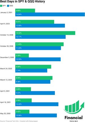 Chicago, IL - April 30, 2025 - Financial Tech Wiz, a leading provider of trading education, released new data confirming that Wednesday, April 9, 2025, marked the third-biggest single-day percentage gain in history for the Invesco QQQ Trust (Nasdaq-100 ETF). QQQ surged about 12%, while the SPDR S&P 500 ETF (SPY) climbed 9.41%, after the U.S. administration announced a 90-day suspension of proposed import tariffs, instantly easing macro-fear that had gripped markets through late March.